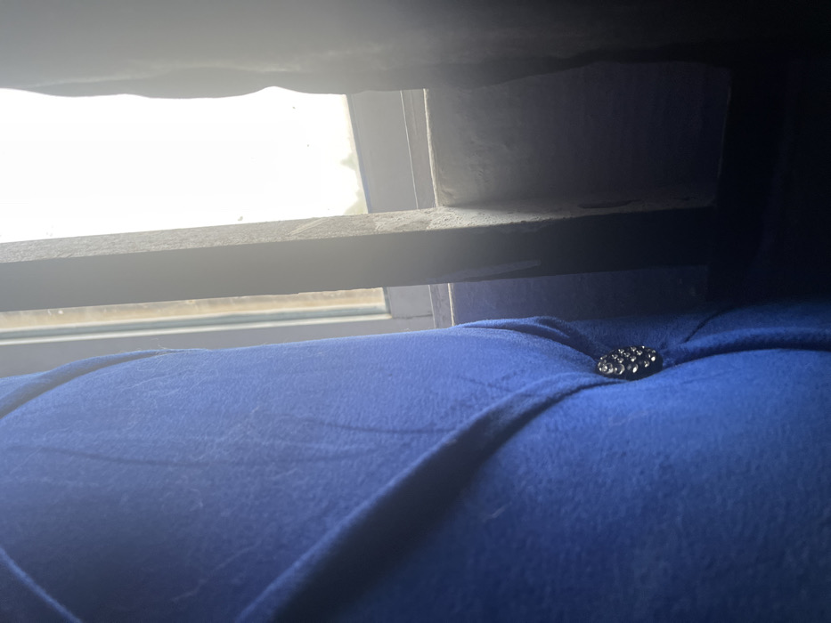 A close-up, somewhat obscured view of a blue, plush surface, possibly fabric, with a dark, decorative button. The background features a window with a bright, diffuse light source, framed by what seems to be the window frame. The composition creates a sense of being partially hidden, with the blue surface taking up the majority of the frame and the window offering a glimpse of the outside world. The lighting casts strong shadows in the darker regions of the photograph.
