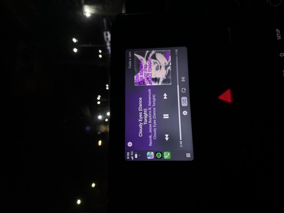 The image captures the interior of a vehicle at night, facing forward through the windshield, specifically in San Bernardino Tlaxcalancingo, Mexico. The central object is an illuminated automotive infotainment system displaying a music application interface. The screen shows the track "Cloudy Eyes (Dance Tonight)" by Reznik, Jesse Boykins III, Keinemusik. The album art features text overlays and a stylized bird motif. The playback indicator shows 2 minutes and 48 seconds elapsed, with 1 minute and 38 seconds remaining. The top left of the screen indicates the time as 6:59, a 5G cellular connection, and a partially full battery icon. Visible app icons on the left include Phone, Spotify, and Apple Maps. Below the screen, a red, triangular hazard warning light button is illuminated. The vehicle's dashboard is dark in the immediate foreground. Through the windshield, the background consists of numerous blurred, bright artificial lights against a dark night sky, indicative of streetlights or other vehicle lights in an urban or suburban setting. No individuals are visible in the frame.