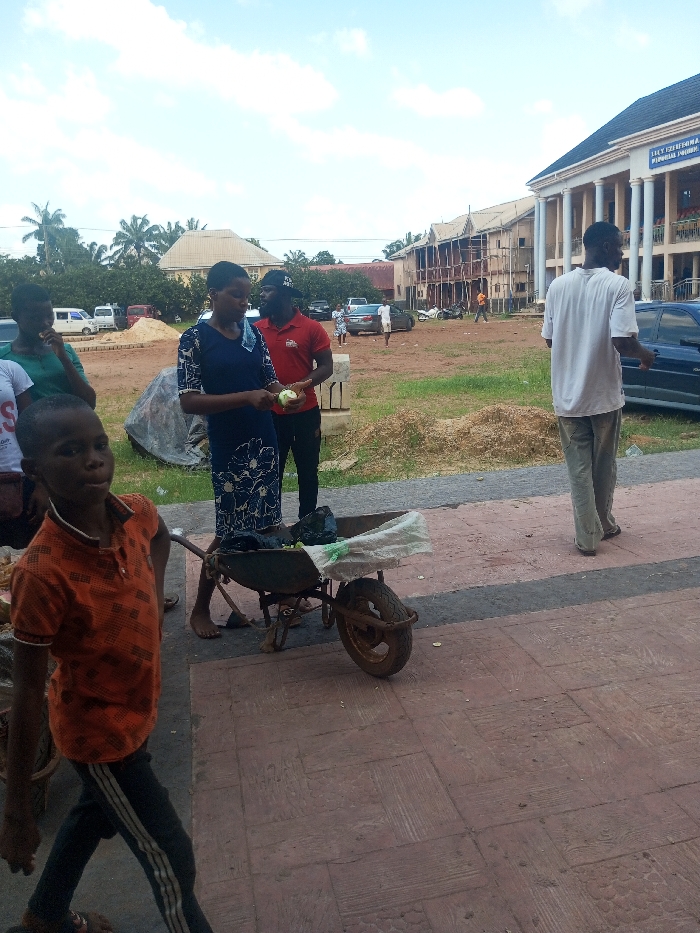 An outdoor scene in Aguata, Nigeria, depicts a daytime environment with multiple individuals and structures