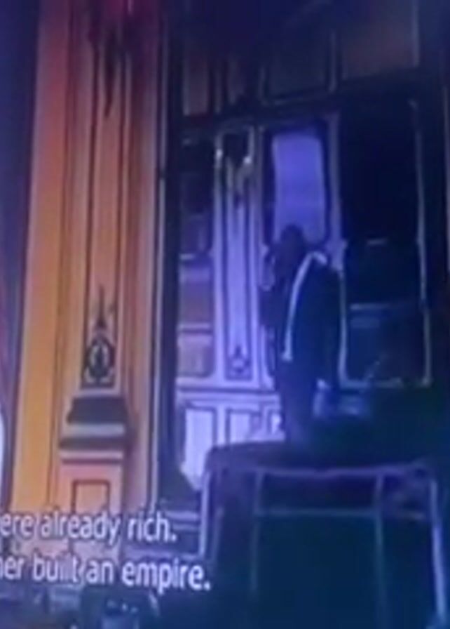 The video appears to be a low-quality recording of a television screen. The scene is indoors, and the focus is on a man with blond hair wearing a blue blazer and white shirt. He is standing near a doorway, and he is speaking. Subtitles read, "We were already rich. Your father built an empire. Yeah. And you were going to..." The background shows ornate decor with gold accents, including a table, lamp, and heavy curtains. Another person, partially obscured by the camera, is standing to the right of the frame. The overall lighting is dim, and the video quality is grainy.