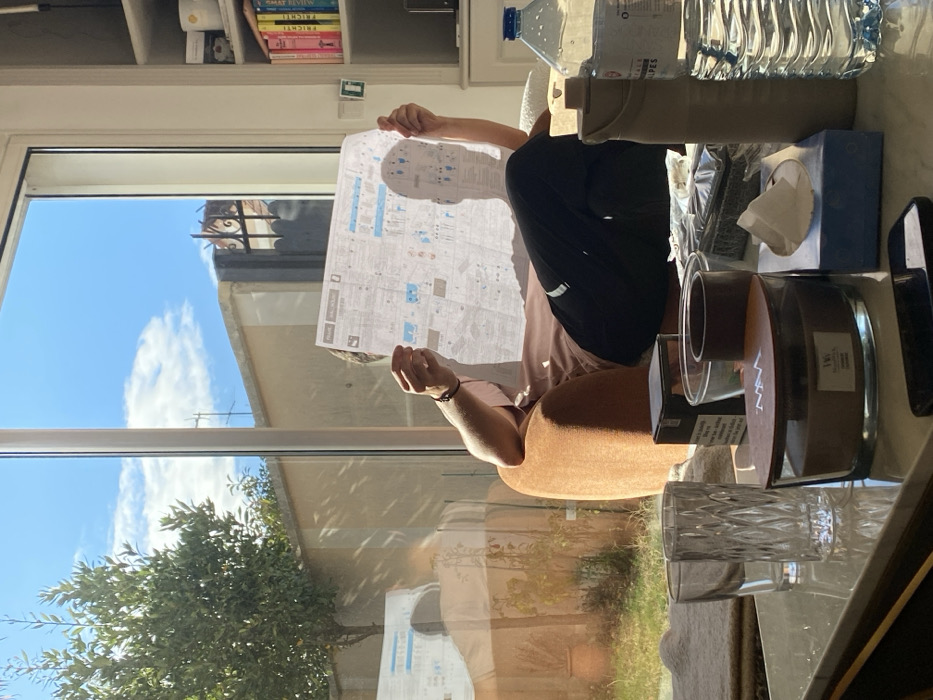 The scene depicts an interior living space in Rueil-Malmaison, France, illuminated by sunlight entering through a large glass door or window. A single individual is seated in an orange-brown upholstered armchair, their face obscured by a large, white, unfolded document, likely a map or infographic, held with both hands. The person wears a light-colored short-sleeved top and dark trousers; a dark bracelet is visible on their left wrist, and their legs are crossed. In the foreground, a white, glossy rectangular coffee table displays several items: two clear drinking glasses (one textured, one plain), a large round dark brown scented candle in a glass container with a wooden lid, labeled "WOODWICK CINNAMON CUBE," a small black rectangular box, a blue tissue box with a white tissue protruding, a clear plastic water bottle labeled "VALPES GRANDE SOURCE DES ALPES," a beige insulated bottle, and a black smartphone. To the right, a white shelving unit is visible, containing various books and decorative objects. Through the glass, an outdoor garden or patio area is visible under a clear blue sky with scattered white clouds. A green leafy tree or shrub stands immediately outside the window. Beyond the tree, a beige concrete wall is visible, with a dark metal gate or railing partially discernible above it. Reflections of the interior, including the seated individual, are present on the glass surface.