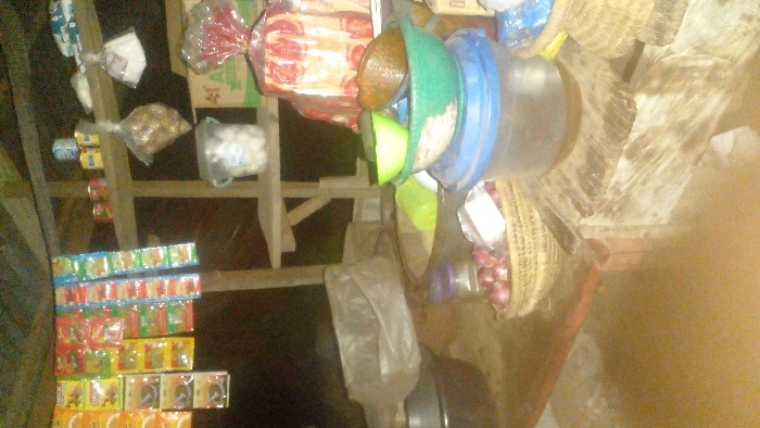 A small shop displays goods for sale. Various food items are packaged in plastic, some on a wooden shelf. A stack of colorful sachets is arranged on the left. Bowls of different colors and sizes are stacked on top of each other. Baskets filled with onions are visible. A gray plastic bag hangs down.