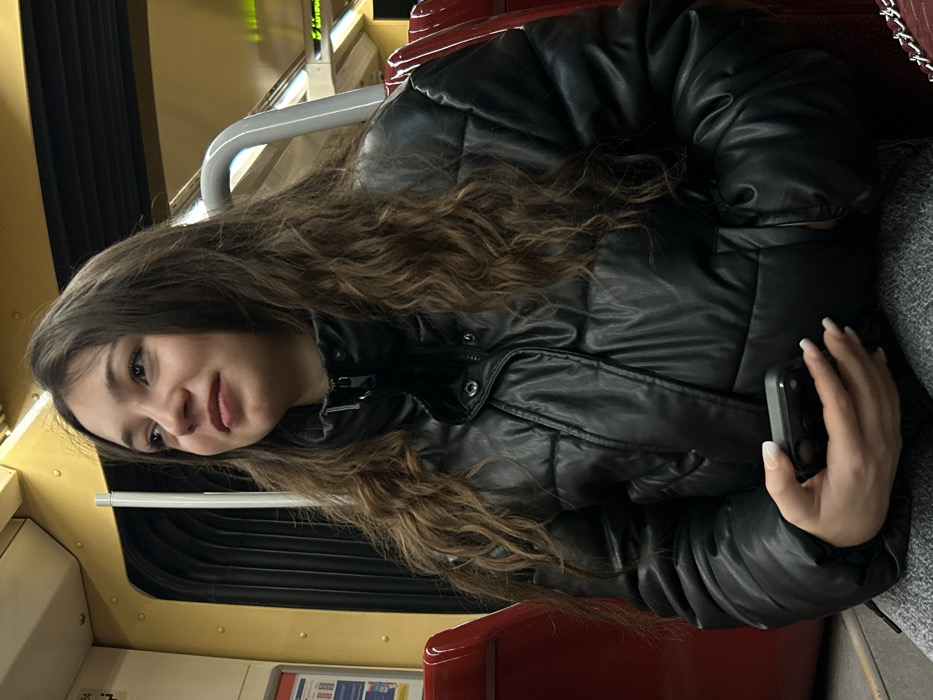 A young woman with long, wavy brown hair sits in what appears to be a public transportation setting
