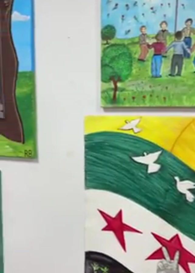 selection of artworks hanging on a white wall. The artworks appear to be paintings and drawings made by children, with themes related to Syria. Some artworks depict scenes of destruction and conflict, while others express hope for peace and unity. One painting shows children holding hands in a circle under the Syrian flag, with roses falling from the sky. Another painting depicts a chained hand giving a peace sign in front of a Syrian flag. One shows a boy sleeping within the borders of Syria, which is cracking. The setting suggests an art exhibition or display showcasing children's perspectives on the Syrian conflict.