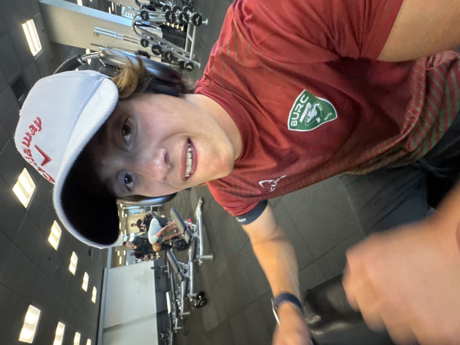 The image depicts a young adult male taking a selfie inside a fitness center. He is positioned in the foreground, facing the camera directly, with his mouth slightly ajar, revealing his upper teeth. He wears a light-colored Callaway baseball cap, over-ear headphones, a red short-sleeved shirt with subtle green horizontal stripes, and a green and white shield-shaped logo on the left chest that reads "BURC" and "1978." A dark blue wristband is visible on his left wrist, and his right hand, slightly blurred from motion, grips a dark object in the bottom right corner of the frame. The background shows a spacious gym environment with dark gray rubberized flooring. Several exercise benches, primarily black-padded and adjustable, are scattered across the floor. To the left, another male individual is seen bent over a bench, possibly performing an exercise, wearing a light blue shirt. Further back, additional gym patrons and equipment are visible, including weight racks on the right side. The ceiling features multiple rectangular fluorescent light fixtures, and structural pillars are present. Based on the "BURC" (Boston University Rowing Club) and "1978" logo on the main subject's shirt, the location is a gym associated with Boston University in Boston, Massachusetts, United States.