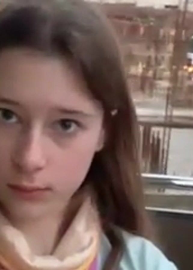 A young woman is standing on a balcony, holding a camera at eye level. She is looking directly into the camera with a serious expression. She has long brown hair and is wearing a light blue shirt and a colorful scarf. Behind her, there is a construction site with exposed rebar, unfinished concrete structures, and a large yellow construction vehicle with a boom. The background gradually transitions to a view of residential buildings, trees, and a distant hillside. The lighting suggests it is either early morning or late afternoon.