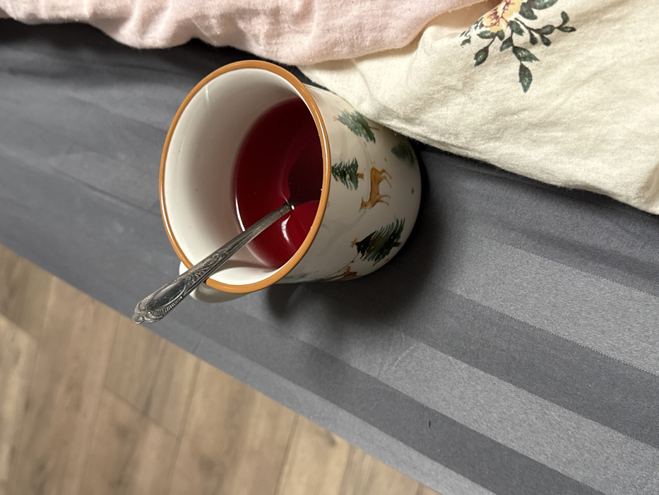 A mug filled with red liquid and a spoon sits on a striped gray surface, likely a bedsheet. The mug has a white interior and a decorated exterior featuring Christmas trees and deer. Next to the mug, there is a light pink blanket and a white blanket with a floral pattern. The bed is positioned near a light-colored wooden floor, adding to the cozy, domestic scene.