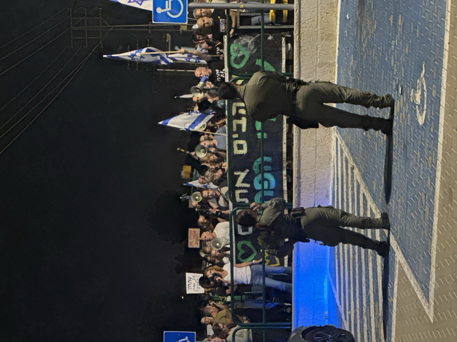 The image depicts a nighttime outdoor scene in the city of Unknown, Israel. In the foreground, two individuals in olive green military-style uniforms stand with their backs to the viewer on a blue paved surface featuring white stripes and a disabled parking symbol. The individual on the left is female, with hair tied back, and the one on the right is male; both are equipped with holsters on their right hips. A dark vehicle is partially visible on the far left, reflecting a blue light onto the ground. A dark metal barrier separates the foreground from a crowd gathered in the background. Draped over this barrier is a dark banner displaying light-colored Hebrew text, including "הביאו את" (Bring the), with additional partially visible text below it, and green heart symbols. Behind the barrier, a crowd estimated at several dozen individuals is visible. Many members of the crowd are holding Israeli flags and megaphones. One prominent white sign on the far left displays Hebrew text, including "שחררו את" (Release the). The background is dark, with overhead power lines and a utility pole visible against the night sky. On the far right, a blue sign with a white disabled parking symbol is also present. The uniformed individuals appear to be observing the actively demonstrating crowd.