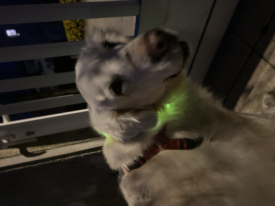 The image depicts a light-colored canine, resembling a Golden Retriever, standing outdoors at night in Truchtersheim, France. The dog is positioned facing slightly right, with its head and upper body visible, wearing a red harness with black stripes and a prominent neon green glowing collar around its neck. Its mouth is slightly open, and its fur appears bright white due to illumination, likely from a flash. To the immediate left is a dark, vertical structure, possibly a door frame or building facade, with a dark handle visible. To the right, a white vertical fence or railing composed of multiple slats stands between the dog and the background. Beyond the fence, the environment is dark, with distant yellow-green foliage visible near the bottom right and a dimly lit building silhouette in the upper right background. The ground beneath the dog appears to be paved or tiled.
