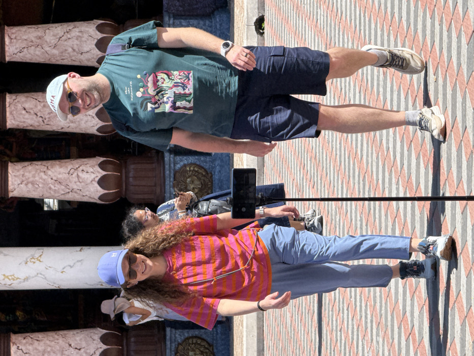 Two people stand outside a building, posing for a picture. The top person is a man with a white cap and dark shirt with an abstract design, and blue shorts. The bottom person is a woman with curly hair, a purple cap and pink striped shirt with light-blue pants. A phone on a stick is recording them. A couple is seated in the background and marble pillars adorn the side of the building. The ground is paved with patterned bricks.
