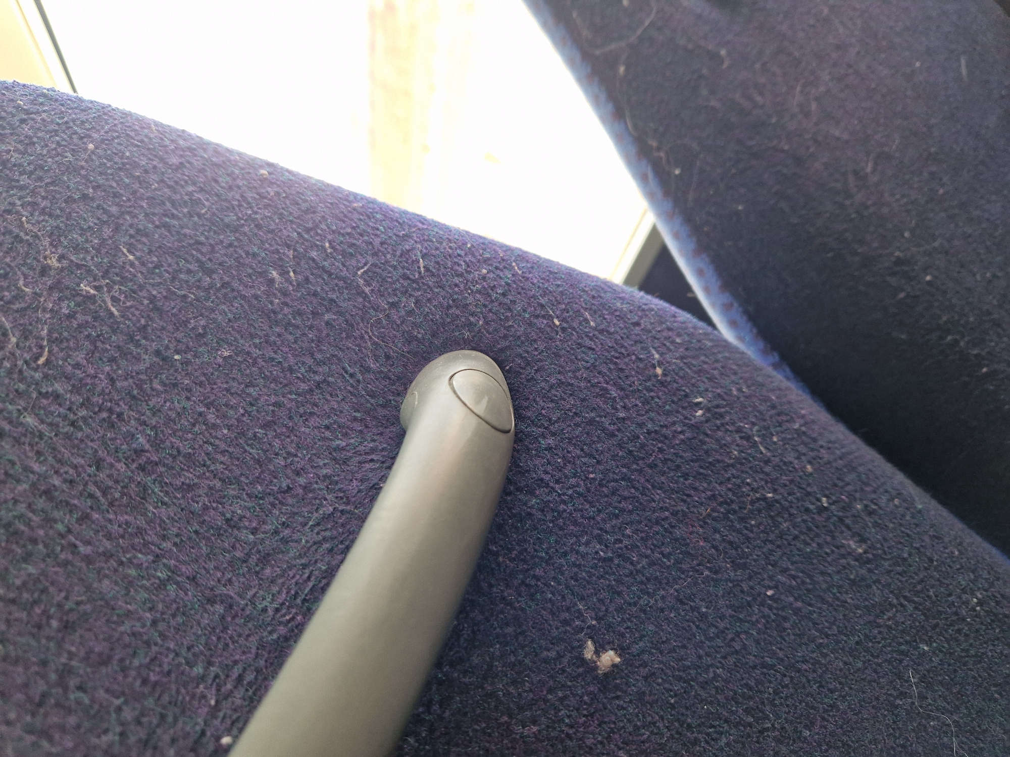 close-up of a blue, textured fabric, likely upholstery, covered with lint and small debris. A gray, plastic armrest is positioned on the fabric, taking up the left side of the frame. The background is blurred, with a hint of light suggesting a window or other light source. The scene depicts the interior of what appears to be public transportation, such as a train or bus, in an unkempt state. No people are visible. The location in the city of Bahovitsa, Bulgaria cannot be ascertained from this image.