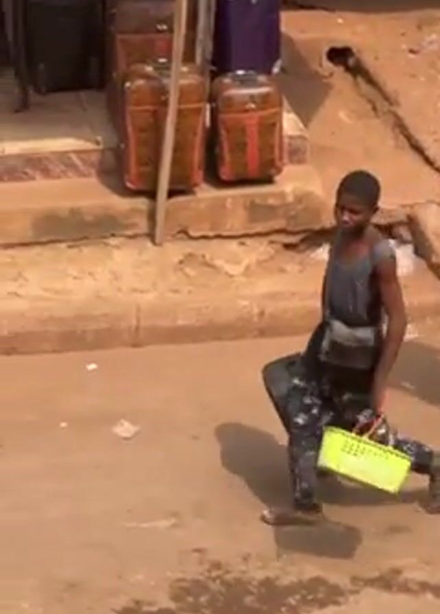 A young man walks along a street carrying a black bag and a green plastic basket. He wears a tank top and pants with a camouflage pattern, along with a crossbody bag. The street is paved with red soil and lined with shops. Some of the shops sell luggage. The young man passes a table laden with jewelry and other small items. Another person in a red shirt walks by in the background.