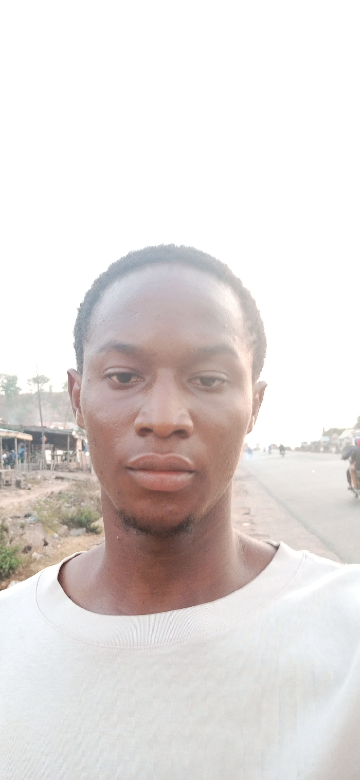 A medium close-up shot of a young, Black male. He has short, dark hair and a slight beard. He wears a plain, light-colored t-shirt. The background features an outdoor scene, including a road and some buildings. The overall lighting suggests either early morning or late afternoon. The photo seems to be taken in a casual setting.