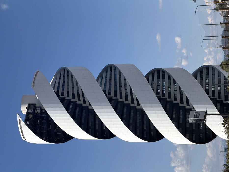 A modern building with a unique architectural design is set against a clear blue sky. The building's façade features a distinctive white, ribbon-like structure that wraps around the central building, creating a twisting or spiral appearance. Regular windows punctuate the interior spaces revealed by the ribbon's curves. The building is positioned horizontally in the frame, with landscape elements, including trees and lampposts, visible at the right. The scene is oriented with the sky at the bottom.