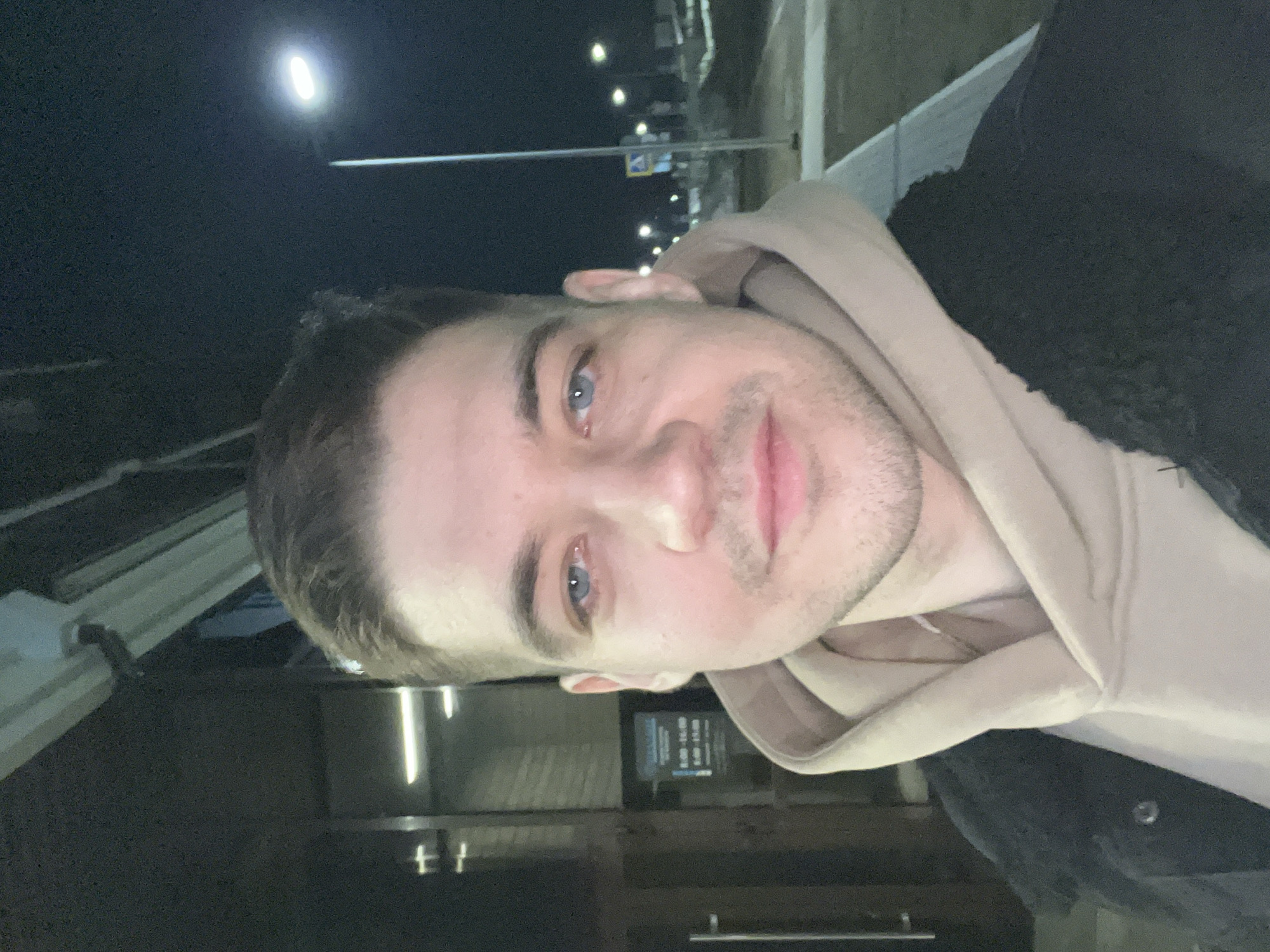 man in a light beige hoodie and dark jacket, likely at night, based on the lighting