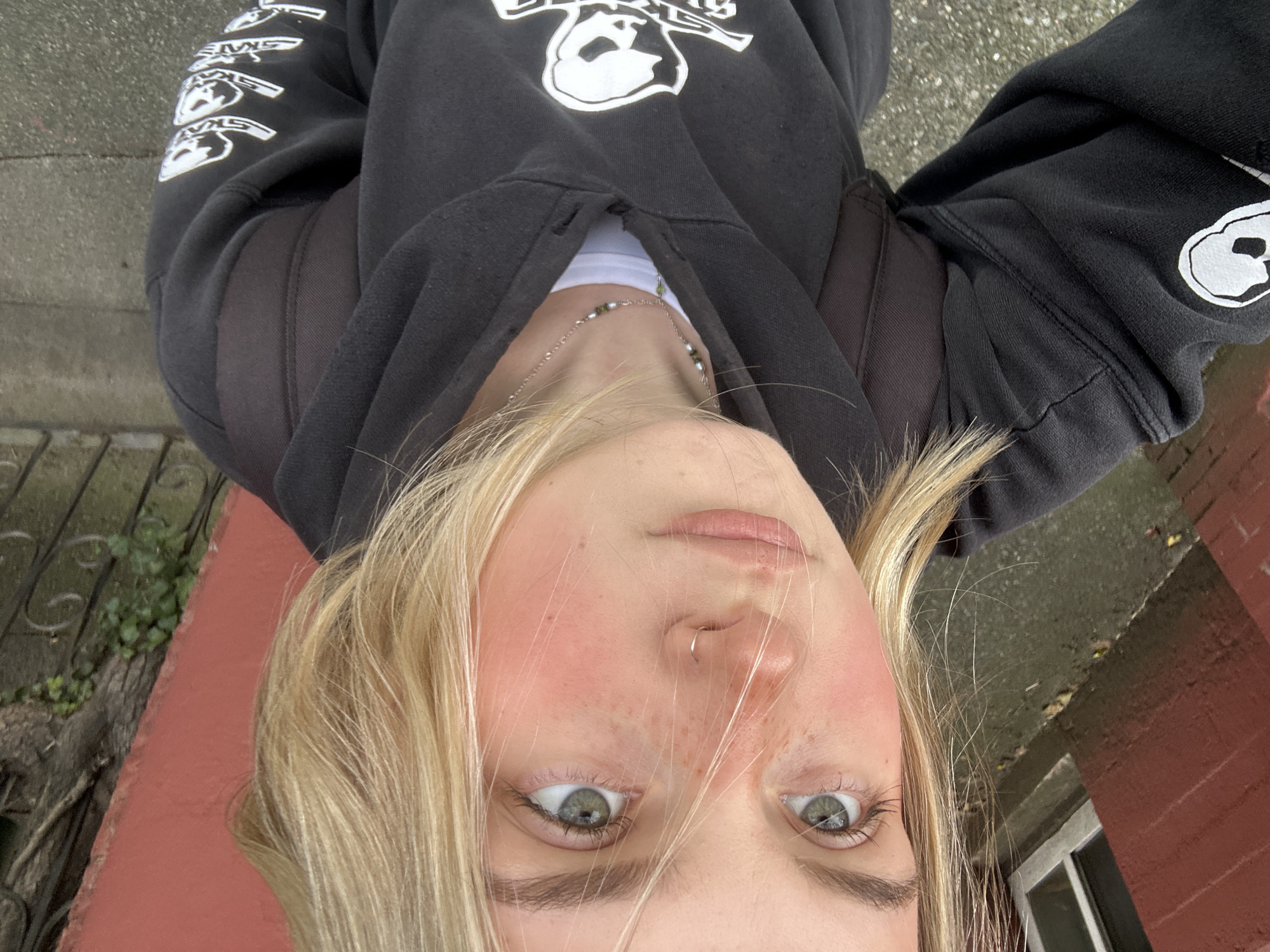 A young individual with shoulder-length blonde hair, light green eyes, and prominent freckles on the nose and cheeks is depicted in a close-up, slightly upward-angled portrait. A small silver hoop nose ring is present on the left nostril. The subject wears a black hooded sweatshirt with a white skull and "SKATE" graphic on the chest and sleeves, layered over a white t-shirt. A silver necklace with pearls, green beads, and a small green pendant is visible around the neck. A dark backpack strap is seen over the subject's right shoulder. The individual is looking upwards and slightly to the right of the frame with a neutral expression. The background is out of focus; to the left, a reddish-brown brick wall with a partial window frame is visible above a grey concrete or asphalt surface with scattered leaves. To the right, a darker reddish-brown wall abuts a black metal fence with decorative scrollwork and green foliage, possibly ivy, growing on an unseen structure. The specific location within Vancouver, Canada, cannot be determined from the visual information provided.