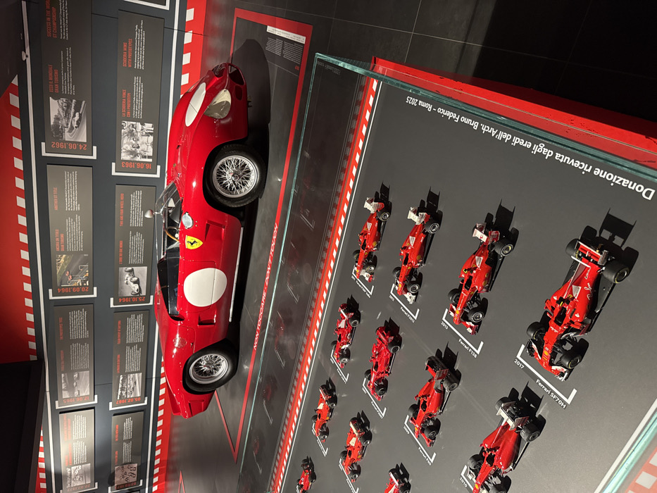 An interior view depicts a brightly lit exhibition hall, identified as the Ferrari Museum in Maranello, Italy