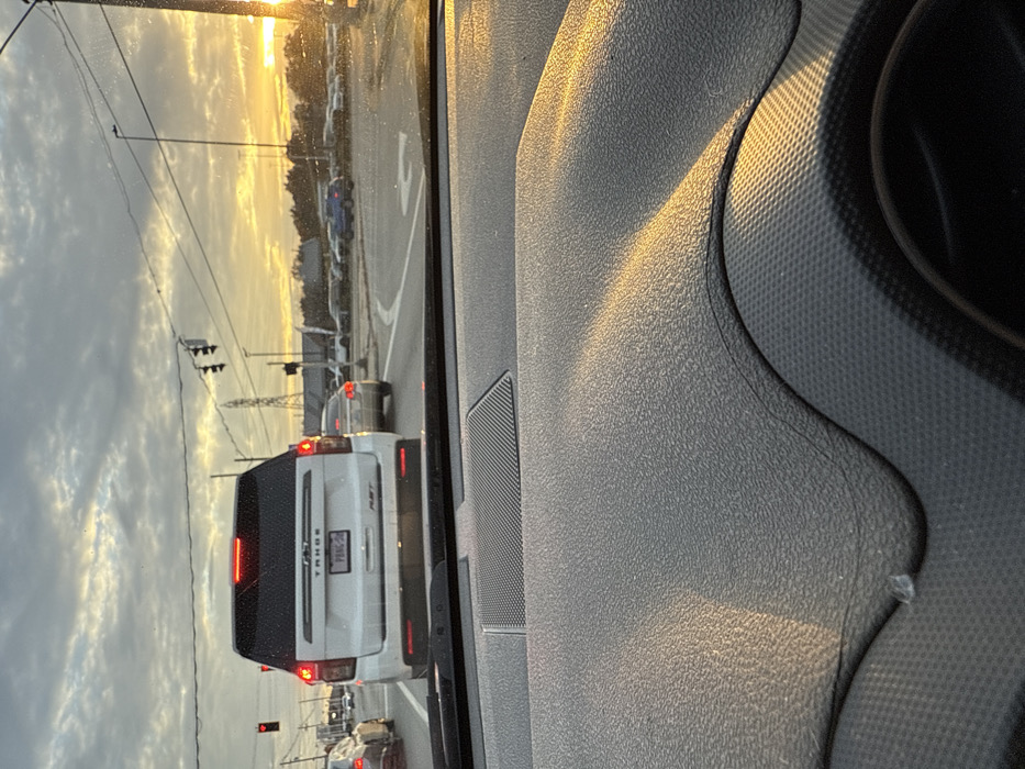 Captured from within a car, the image frames a traffic scene at dusk. A white SUV, identified as a Tahoe by the badging, is stopped ahead, its red taillights glowing. A sliver of a car can be seen to the right of it and cars trailing behind it. Traffic lights are visible beyond, against a sky streaked with clouds and the setting sun. The car's dashboard, textured in gray and black, occupies a large portion of the foreground, slightly out of focus.