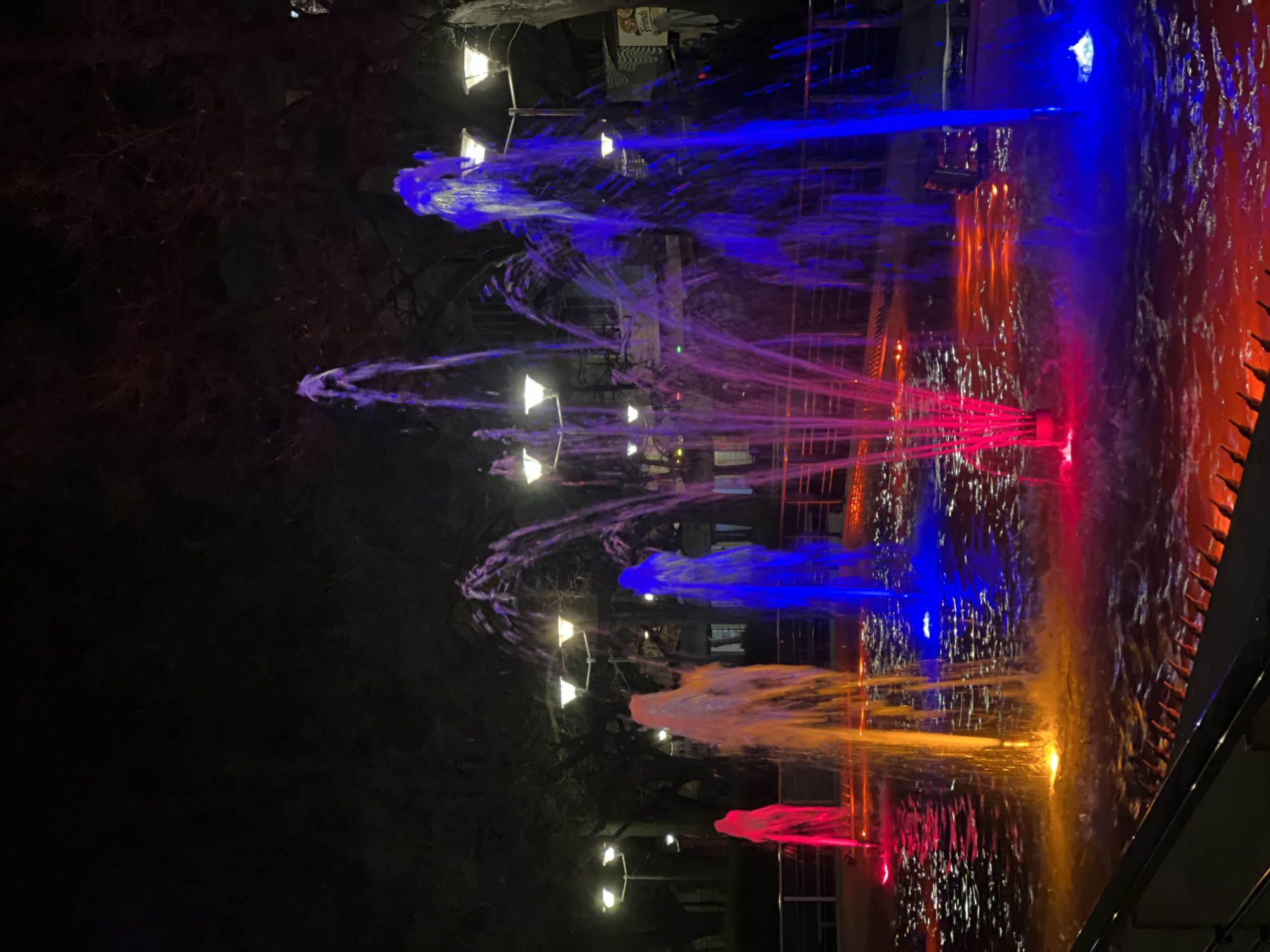 colorful fountain at night in Pernik, Bulgaria. The fountain has multiple streams of water lit up in blue, red, and orange. The background includes trees and streetlights. There is a dark building visible behind the fountain. The foreground features the edge of a pool with the fountain water reflecting the light.