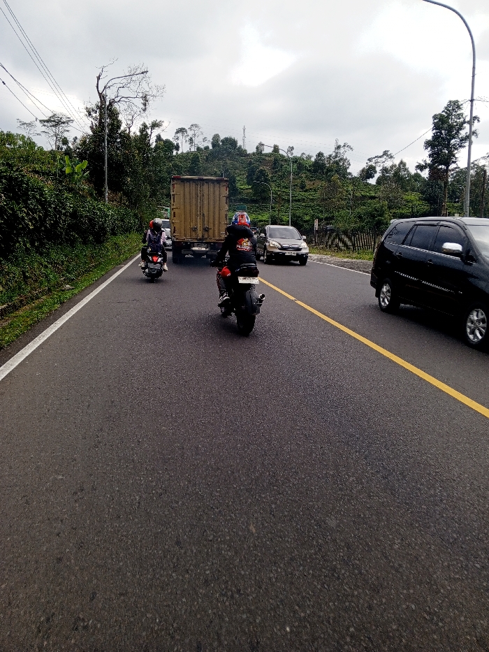 The image displays a two-lane asphalt road in Cisarua, Indonesia, under an overcast sky