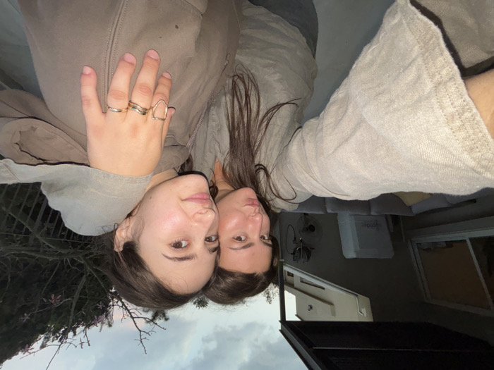 The image captures two young adult females on an outdoor patio in Ramat HaSharon, Israel, during dusk. The female on the left, with long dark hair, extends her left arm forward to take a selfie, presenting a slight pouting expression. She wears a light-colored, long-sleeved top. The female on the right, also with long dark hair, wears a brown hooded jacket and has her right arm around the shoulder of the female on the left. She looks towards the camera with a neutral expression. Her right hand displays multiple gold-colored rings: an open-shaped ring on her index finger, two wavy rings on her middle finger, and a simple band on her ring finger. The background reveals a residential setting. A dark-colored awning structure extends over a portion of the patio. Below the awning, a light-colored building wall with a horizontal window is visible. A light-colored outdoor sectional sofa is present, along with a white rectangular appliance, marked with text resembling "Sofir" or "Soplair," positioned near the sofa. A white-caged wall-mounted fan is visible further right. Beyond the patio, tree branches with sparse leaves and faint pink blossoms are silhouetted against a cloudy, transitioning sky, indicative of evening light. Part of another light-colored building is visible in the upper background.