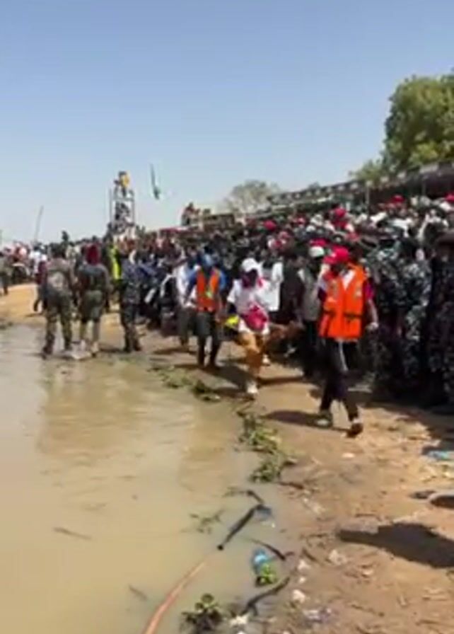 crowded scene near a body of water, possibly a river or lake. People are gathered, including security personnel and medical personnel. Some individuals are wearing orange safety vests and others have white shirts with a red cross emblem, indicating a medical or first aid role. The medical personnel are carrying a person on a stretcher through the crowd. There is litter on the ground, including plastic bottles. In the background, there is a raised structure with people on top of it, possibly for observation or event staging. The weather appears sunny and clear. The scene suggests a public event or gathering where medical support is needed.