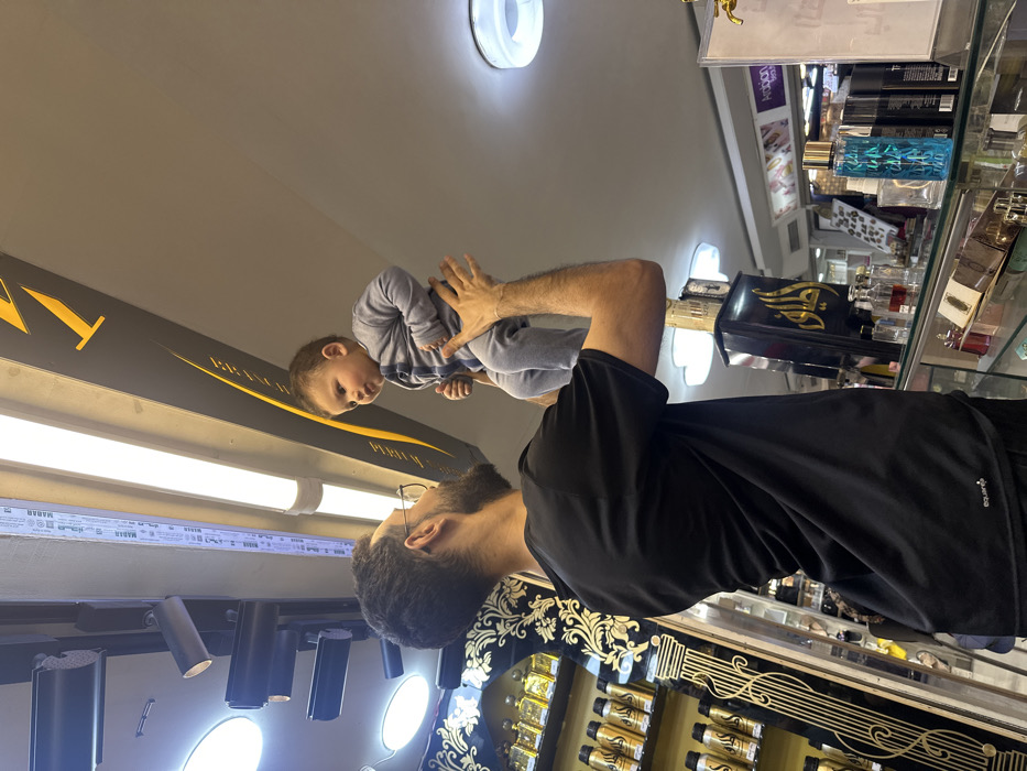 The scene depicts the interior of a retail store in Barza Municipality, Syria. An adult male, with a beard and eyeglasses, wearing a black short-sleeved shirt, is holding an infant aloft with both hands. The male is positioned with his back partially to the viewer, looking upwards towards the infant. The infant, dressed in a light blue long-sleeved outfit, faces the male. To the left, multi-tiered shelves display numerous gold-colored bottles and aerosol cans, many featuring Arabic script, indicative of perfumes or deodorants. To the right, a glass-top display counter holds various perfume bottles, including a prominent turquoise spray bottle and other clear and black containers. A black display unit with gold Arabic calligraphy is situated on this counter, beneath where the infant is held. The ceiling is equipped with a combination of track lighting with multiple spotlights, linear fluorescent tube lights, and circular flush-mount fixtures. A dark horizontal sign with yellow stylized text, including a distinct "M" shape, runs along the upper ceiling area. Partial signage further in the background contains the word "Arabian."