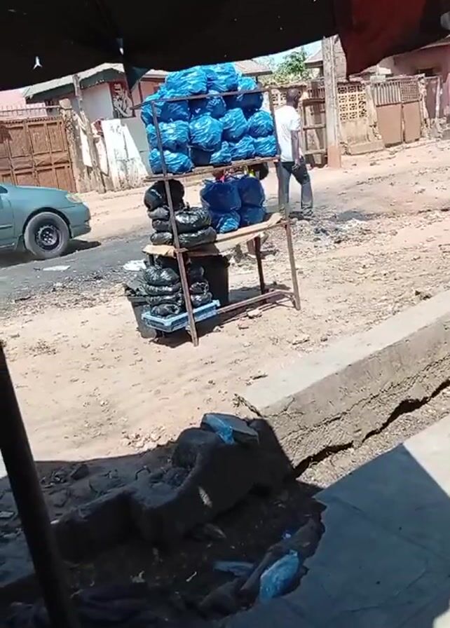 street scene in an area with sandy, unpaved roads. A metal shelf holds several stacks of items wrapped in blue and black plastic bags. A car is parked on the side of the road. Two people walk past the shelf, one carrying a small child. The video is filmed from under an umbrella or awning. The scene appears to be in a residential or commercial area, with buildings and fences visible in the background.
