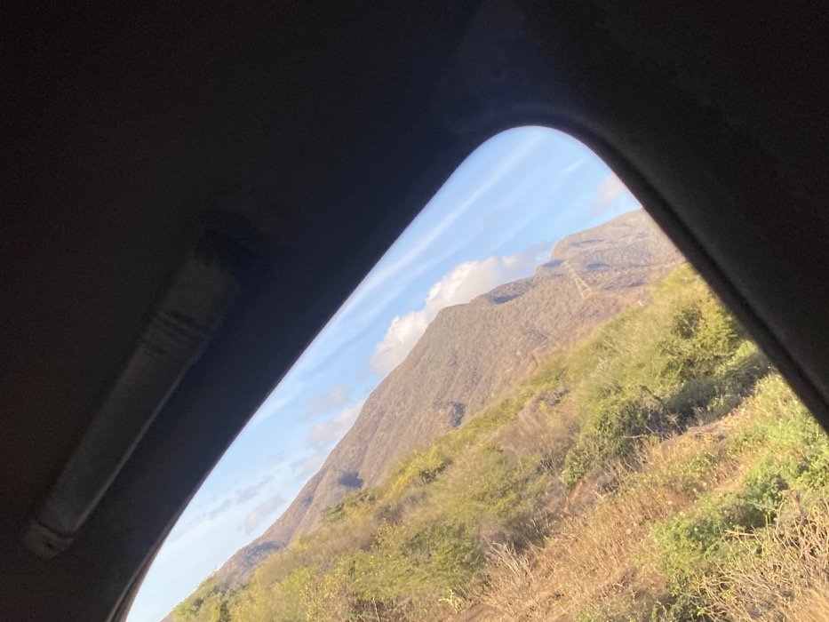 The image presents a mountainous landscape viewed through a vehicle window in La Guardia, Venezuela