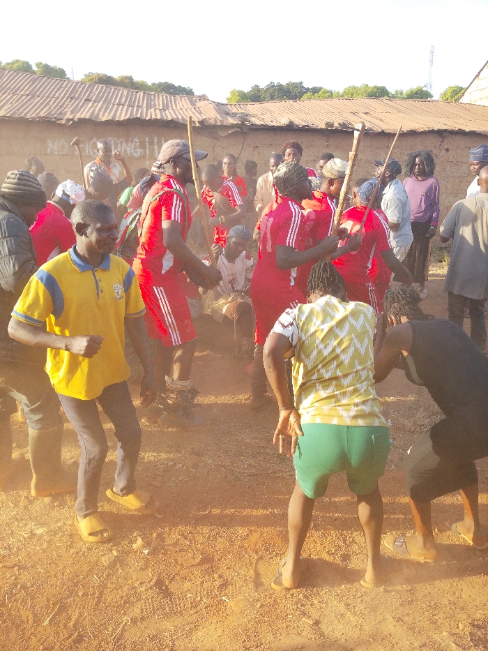 The image depicts an outdoor gathering of approximately twenty individuals in Vodni, Nigeria, under daylight conditions. The scene is set on unpaved reddish-brown dirt ground, with visible dust suspended in the air. In the background, a single-story structure with a corrugated metal roof and a light-colored wall features a partially visible inscription "NO FIGHTING." A group of at least eight individuals centrally located wear matching red short-sleeved shirts with white shoulder stripes and red bottoms with white side stripes. Several in this group hold slender wooden staffs and appear to be moving rhythmically, generating dust. To the left foreground, a man in a yellow and blue polo shirt, dark pants, and yellow slides gestures with his left arm while stepping. To the right foreground, another individual, viewed from behind, wears a yellow and white patterned shirt and green shorts, crouched with hands slightly raised. Other individuals in varied attire are present around the perimeter, observing or participating. A person seated on the ground near a small drum is visible in the middle ground.