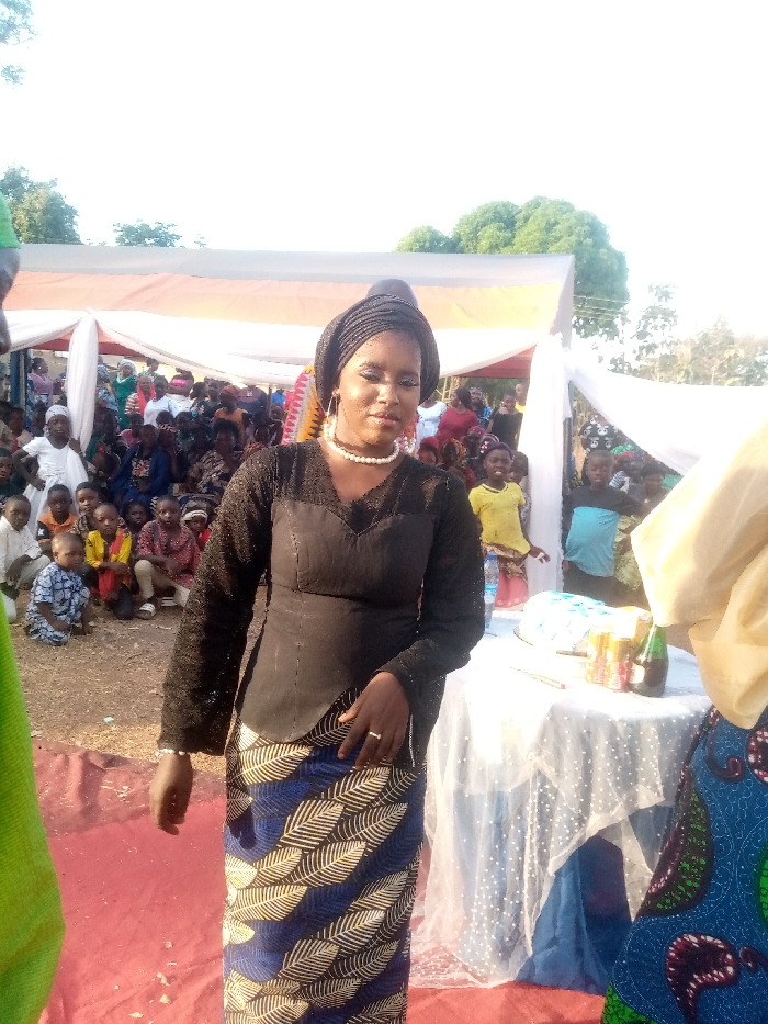 A woman stands at an outdoor gathering, wearing a black blouse with long, textured sleeves and a blue patterned skirt. She has a head wrap, pearl necklace, and hoop earrings. Behind her are several people, many of them children, seated or standing under a white canopy. A table covered with a white cloth holds bottles and a cake. Other people are partially visible on either side of the woman.