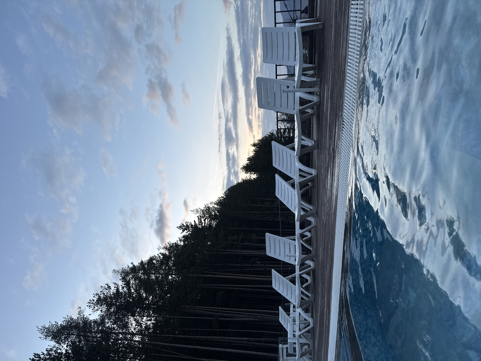 The image presents an outdoor pool area located in Sapareva Banya, Bulgaria, observed during conditions indicative of dawn or dusk. The foreground features a swimming pool with blue tiled water exhibiting ripples and reflections of the sky. Adjacent to the pool edge is a linear overflow drain with a metallic grate, transitioning to a light brown wooden deck. Situated on this deck is a row of eight unoccupied white plastic lounge chairs, arranged uniformly facing away from the camera. A partial view of a small white plastic side table is visible next to the leftmost lounge chair. Behind the chairs, a dark metal railing runs horizontally. The background on the left is dominated by a dense, silhouetted forest of tall coniferous trees. The right side of the background reveals distant, indistinct terrain under a sky with a gradient of pale blue, pink, and grey hues, containing scattered clouds. A faint white contrail is discernible in the upper right portion of the sky. No individuals or active subjects are present in the scene.
