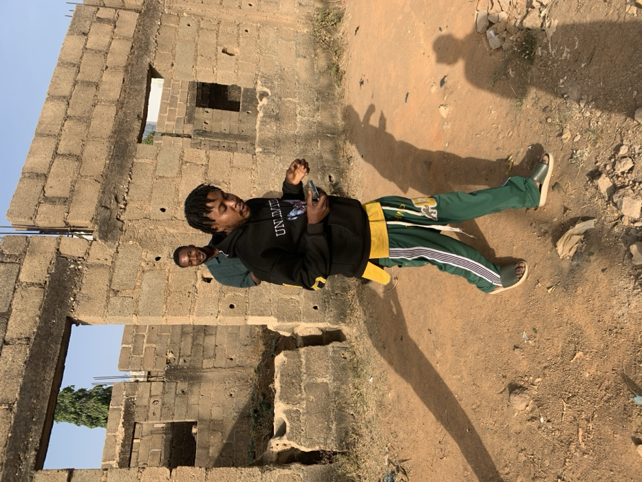 Two men stand outside an unfinished building with exposed cinder blocks. The foreground man faces the camera, wearing a black hoodie, green pants with white stripes, and slides, holding a phone. The other man, slightly out of focus, stands behind him. The ground is dirt with scattered rocks. The building's window openings reveal sky and a green tree. Shadows are cast on the ground.