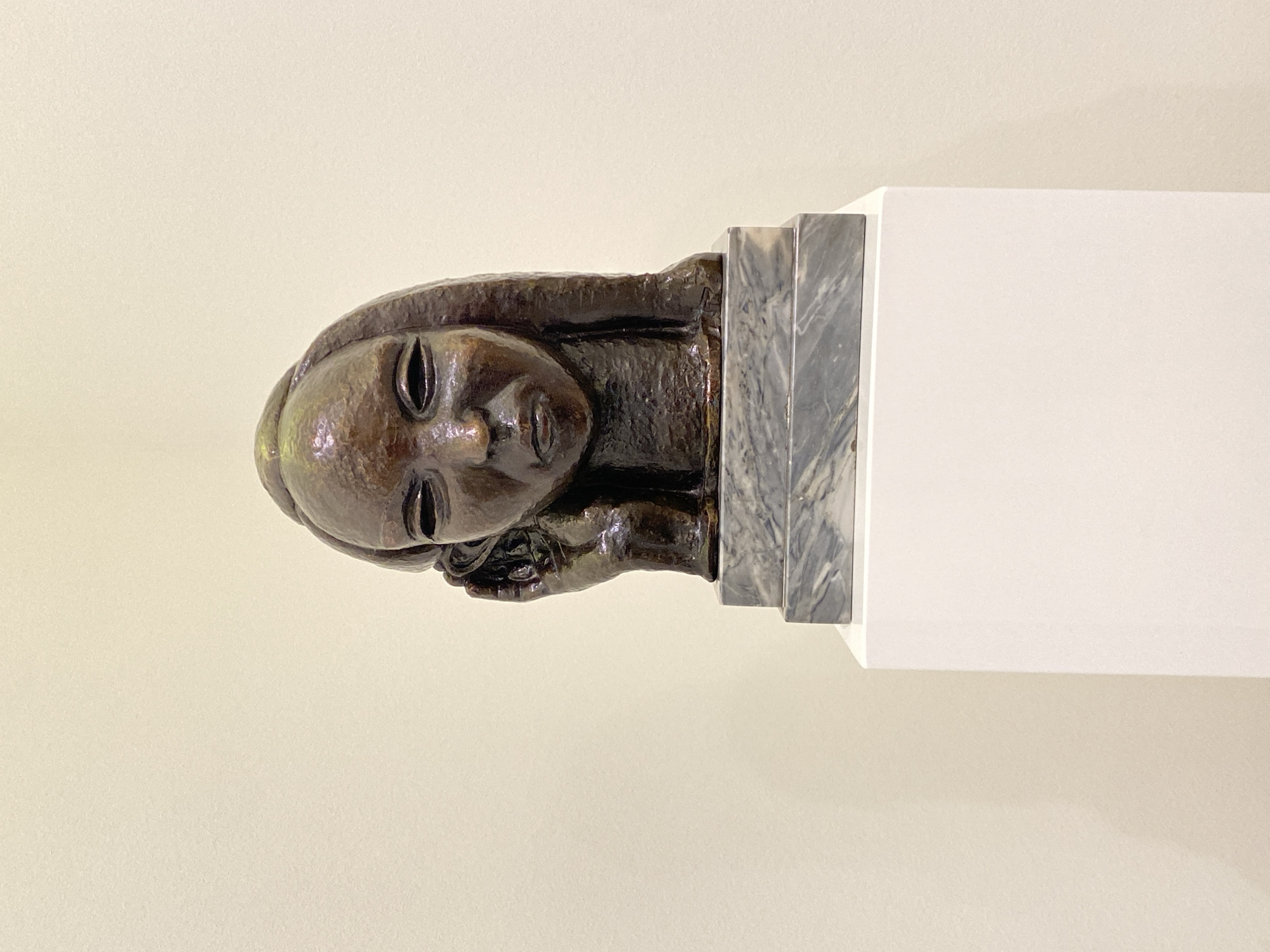 The image displays a bronze bust of a female head and upper torso, centrally positioned and slightly angled to the right