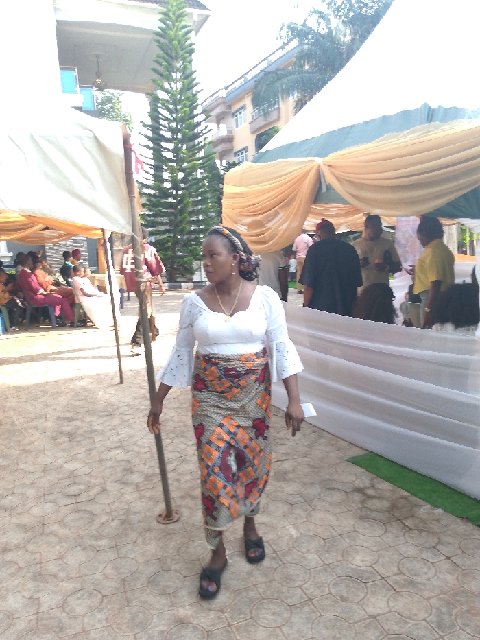A woman with a headscarf wears a white blouse and a patterned sarong-style skirt. She is outdoors on a paved area, near a tent with beige draping. People are seated and standing in the background. A tall evergreen tree stands upright next to a tent pole. The sky is visible with trees.