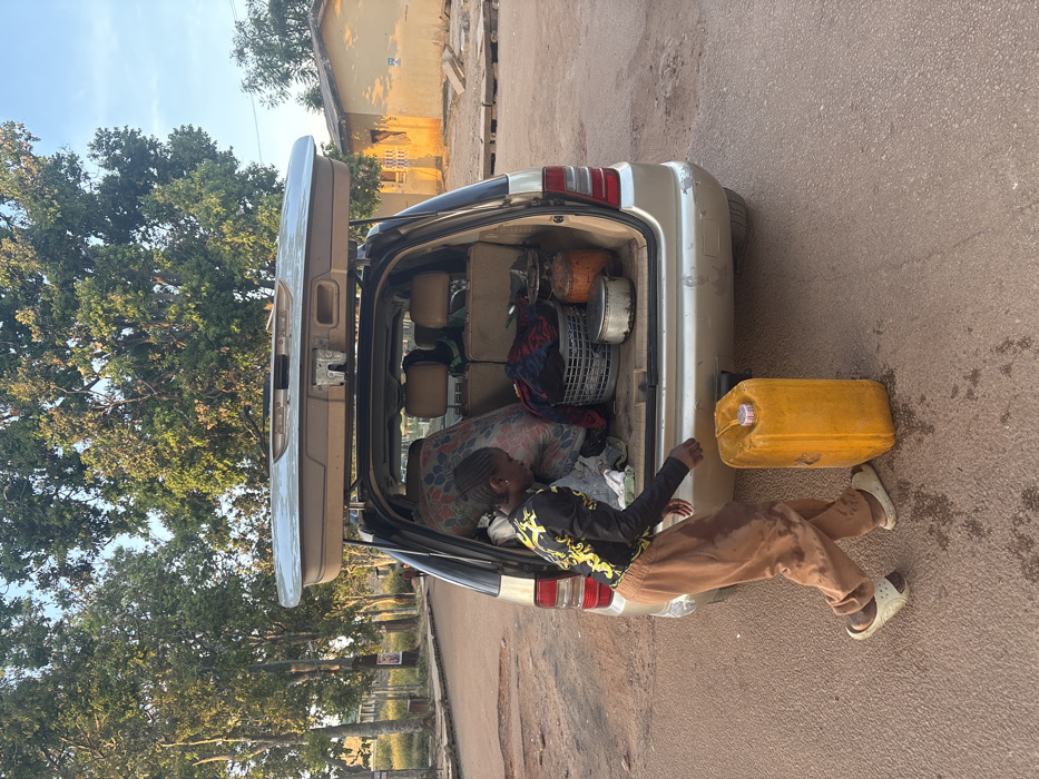 An outdoor scene in Rafin Par, Nigeria, depicts a gold-colored SUV parked on a paved road with visible cracks and potholes. The vehicle's rear liftgate is fully open, revealing a cargo area heavily loaded with a large patterned bundle, a dark blanket, a woven basket, two cooking pots, and an orange gas cylinder. A child, wearing a black patterned shirt, brown pants, and light sandals, stands to the left of the SUV's rear, leaning towards a yellow plastic jerrycan on the pavement. Dark, wet stains are present on the pavement around the jerrycan. In the background, a street lined with green trees and distant structures extends to the left, while a tan single-story building is visible to the right under natural daylight.