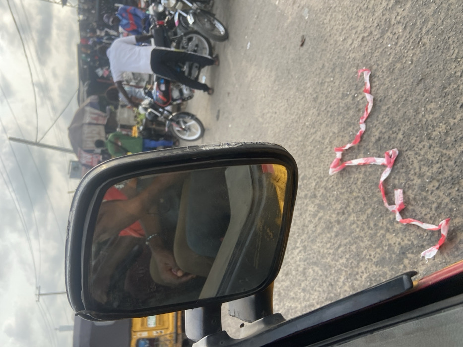 An image captured from within a vehicle on an overcast day in Alasia, Nigeria, depicts an active street scene. In the immediate foreground, the black exterior side mirror of the vehicle is visible, reflecting the upper torso, arms, and legs of an occupant wearing a red top and light-colored pants, with a beaded bracelet on one wrist. Below the mirror, on the gray asphalt road, a tangled piece of red and white striped material, consistent with caution tape, lies on the ground. Beyond the vehicle, the midground shows a cluster of parked and possibly moving motorcycles on the asphalt. A male individual in a white short-sleeved shirt and dark trousers is observed standing behind one of the motorcycles, appearing to interact with it. Further back, another male individual wearing a green shirt is visible near a market stall. On the far left, a portion of a yellow tricycle (keke napep) is discernible. The background reveals a bustling market environment with various stalls, some featuring umbrella-like canopies, and other indistinct structures. Overhead utility poles and electrical wires are visible against the cloudy sky. Multiple other individuals are present throughout the background, engaged in various activities typical of a street or market setting.