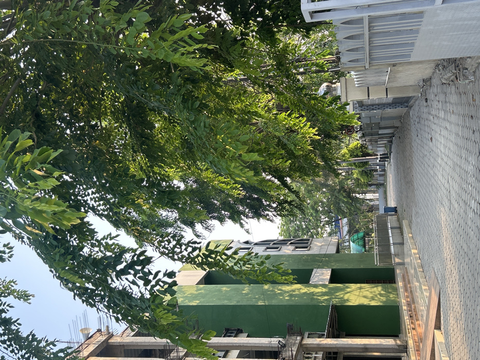 The image displays a quiet, paved pedestrian pathway in Bekasi, Indonesia, under a clear sky. The pathway, constructed of interlocking concrete pavers, extends into the distance, appearing devoid of human presence. On the left, a multi-story building features a green-painted lower facade with an entrance accessible by both steps and a wooden ramp. Adjacent to this structure, an unfinished concrete building with exposed rebar and multiple antennas on its roof is partially visible. A blue waste bin is positioned further down the pathway on the left. On the right, a light-colored perimeter wall with decorative arched elements and a silver gate encloses a property. Pillars along this wall are topped with small, silver, onion-shaped domes. Lush green foliage from mature trees overhangs the path from both sides, casting natural shadows. A red circular "No Parking" sign is visible behind the right wall. In the background, additional green structures and obscured commercial signage are discernible amidst more trees.