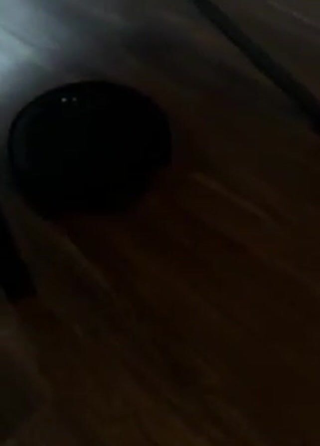 black, circular robot vacuum cleaner operating on a dark wood floor. At the start, the vacuum is shown partially under a piece of furniture with black legs, the light illuminating the floor beneath. It bumps into the leg of the furniture and moves away. The camera follows it as it travels across the floor. A person wearing white sneakers and shorts then appears, standing next to the vacuum. The lighting in the room is dim.