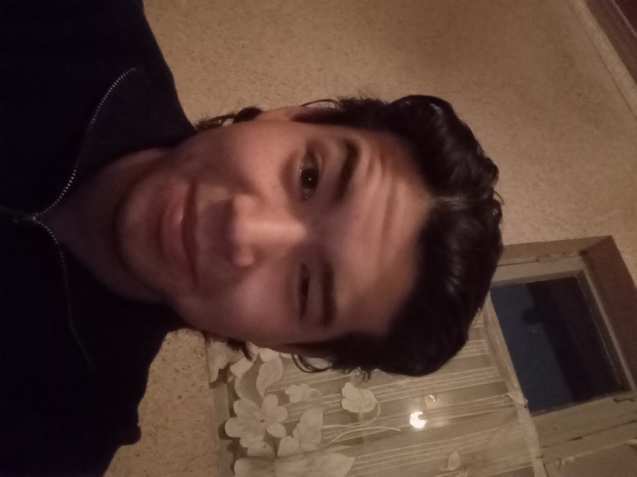 A person with dark hair and a black jacket is facing the camera. The person is winking with their right eye. They have fair skin. Behind the person is a light-colored wall and a window covered with a sheer curtain patterned with flowers. There is a dark rectangle in the window. The lighting appears to be dim.