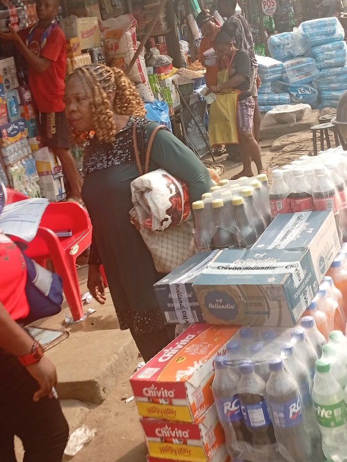 A bustling market scene features a woman with blonde, braided hair, carrying a patterned bag and blanket. She's near stacks of Chivita juice boxes, Hollandia yogurt drinks, and various soda bottles. To her left is a red chair and a person in a red shirt. In the background, a person in a red shirt is standing near shelves filled with various goods, while another individual wearing a yellow apron appears to be completing a transaction by a POS stand. The overall environment appears crowded and vibrant with commerce.