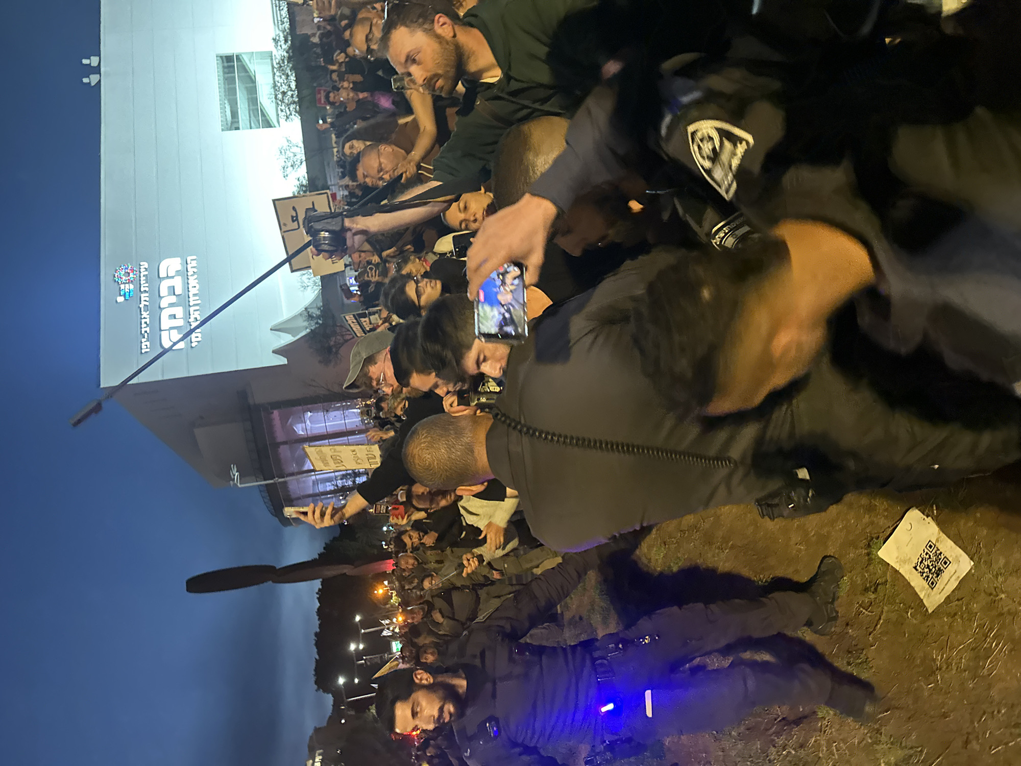 The image depicts a scene at night outside the Habima National Theatre in Tel Aviv, Israel, as indicated by the sign on the building. A crowd of people, including what appear to be police officers, are congregated on the ground. Many are holding up mobile phones to record the scene. One officer appears to be detaining or restraining an individual on the ground. Another officer is lying on the ground, next to a QR code printed on a piece of paper. The overall environment suggests a protest or demonstration.