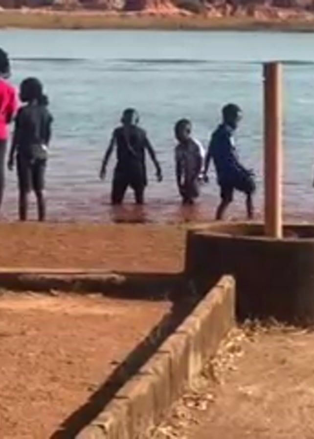 Several children are standing in a body of water, a lake or river, near a dirt bank. The water is relatively calm. Behind them, across the water, there is a bluff-like land formation with some buildings visible on top. On the bank, there is a concrete structure with a wooden pole in the middle, and a sign is standing in the water near the bank. The children are of varying heights and are wearing casual clothes. Some are simply standing in the water while others are moving around. The ground on the bank is reddish-brown dirt, and there is some sparse vegetation. A partial view of a dark object, possibly an umbrella, is visible in the lower left corner of the frame.