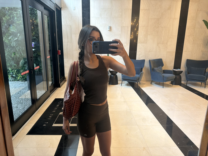 A female subject is depicted taking a mirror selfie inside a contemporary lobby or common area, identified by a floor mat displaying "AT THE DISTRICT TA," indicating a location within The District area of Miami, United States of America. The subject, whose face is largely obscured by the smartphone she holds, has long dark hair styled in a single braid and wears eyeglasses. She is dressed in a dark brown crop top and matching high-waisted biker shorts, with an "alo" logo visible on the left thigh. She carries a reddish-brown, possibly textured, shoulder bag over her right shoulder. To the subject's left are large glass double doors with dark frames, opening to an exterior or courtyard area featuring a dense green wall of foliage. A red "PUSH" sign is visible on the left door's frame. The interior features light-colored, possibly marble or travertine, paneled walls with contrasting vertical dark stone accents. The polished floor consists of light-colored tiles with wide dark stripes. To the subject's right, a waiting area is furnished with three identical light blue upholstered armchairs with dark legs, separated by two small, dark cylindrical side tables.