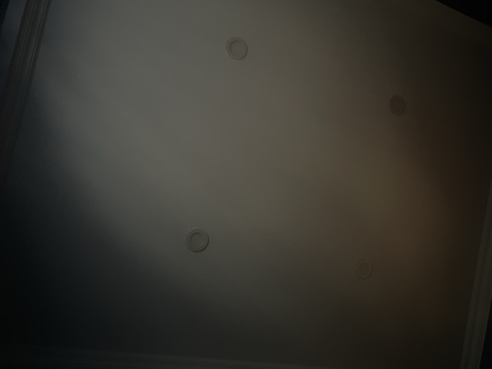 The image depicts an indoor ceiling in Tbilisi, Georgia, presented from a low-angle perspective. The ceiling surface is a light, uniform color, likely white or off-white. Four circular recessed light fixtures are integrated into the ceiling, positioned approximately one in each quadrant of the frame. The overall scene is dimly lit, with a prominent diagonal light gradient visible across the ceiling; the upper-left and lower-left areas appear significantly darker than the right side, suggesting an uneven ambient light source. The recessed light fixtures are not visibly illuminated. A dark, linear architectural element, consistent with crown molding or a ceiling-wall junction, is visible along the bottom edge of the frame, and a partial vertical dark line is present on the far right edge. No individuals, specific objects beyond the ceiling fixtures, or actions are depicted within the frame.