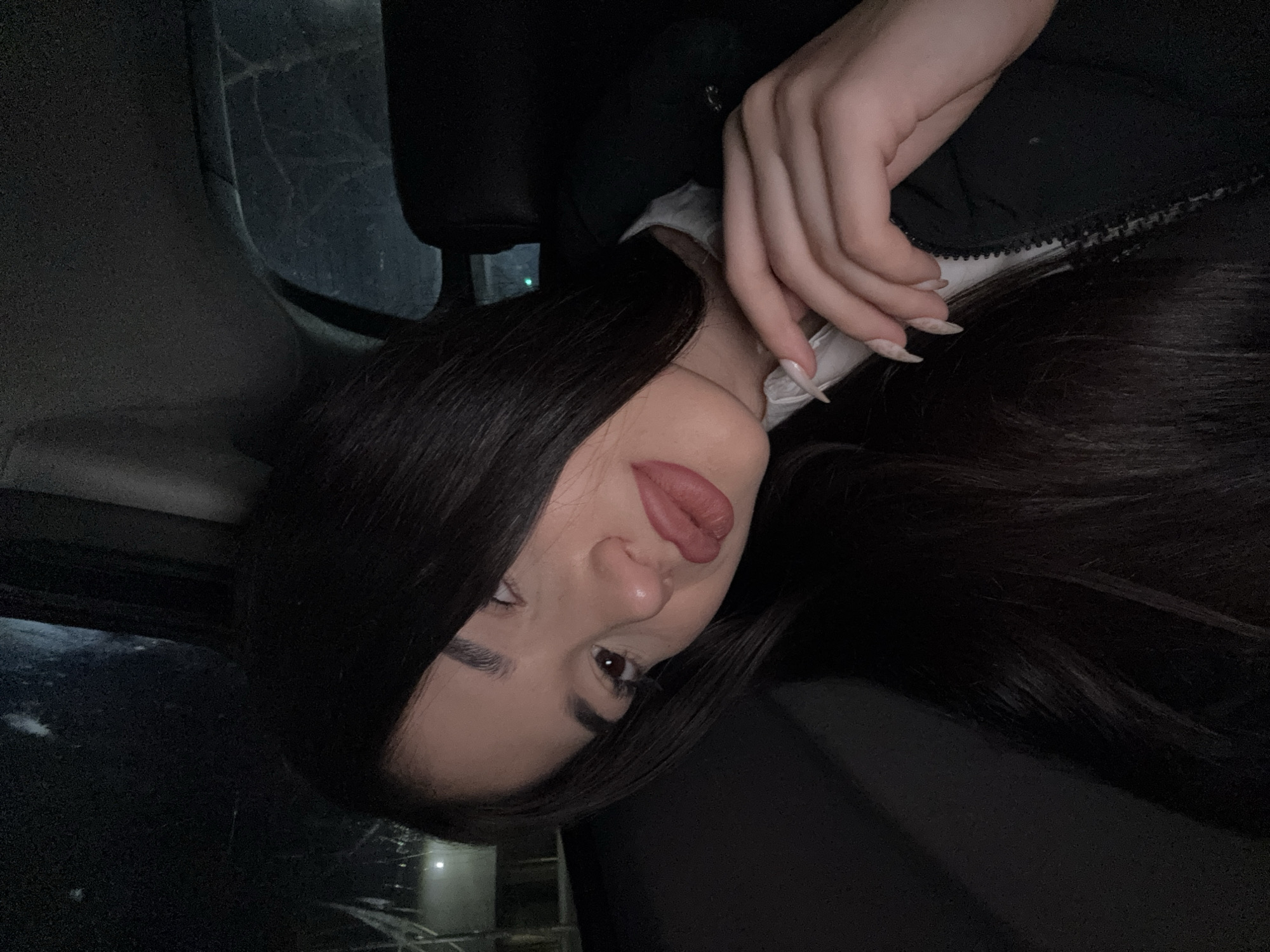 The scene depicts a female individual inside a vehicle at night. The precise location within the city of Plovdiv, Bulgaria, cannot be determined from the available visual information; however, exterior lights suggest an urban or suburban setting. The subject, a female, occupies the majority of the frame, positioned towards the front, angled slightly left of the camera. She has long, dark, straight hair flowing over her right shoulder and chest. Her facial features include dark eyebrows, discernible eye makeup, and light-colored lipstick on full lips. Her eyes are dark, looking slightly away from the camera. She is wearing a white collared garment beneath a dark, possibly black, zippered jacket or coat. Her left hand is visible in the lower right quadrant of the image, resting near her chest. Her fingernails are long, pointed, and light-colored with a subtle patterned design. The interior of the vehicle is dark. A dark headliner is visible in the upper sections of the image. A dark seat or interior paneling is present behind and to the right of the subject. Through the vehicle's windows, indistinct exterior details are visible: a bright light source appears in the upper left, and faint, dark shapes, possibly tree branches, are discernible against the night sky through a rear window, alongside a distant green light. No explicit actions beyond posing for a photograph are evident. No interactions with other individuals or objects are depicted.