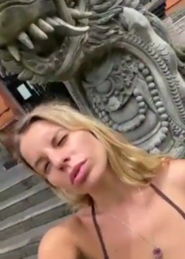 A blonde woman wearing a dark-colored halter top and a necklace stands in front of a large, ornate stone dragon statue. The woman is looking at the camera and making silly faces, including sticking her tongue out and making a scrunched-up face. She reaches up and touches the dragon statue with one hand. The background shows a building with intricate architectural details and some green plants. The sky is overcast.