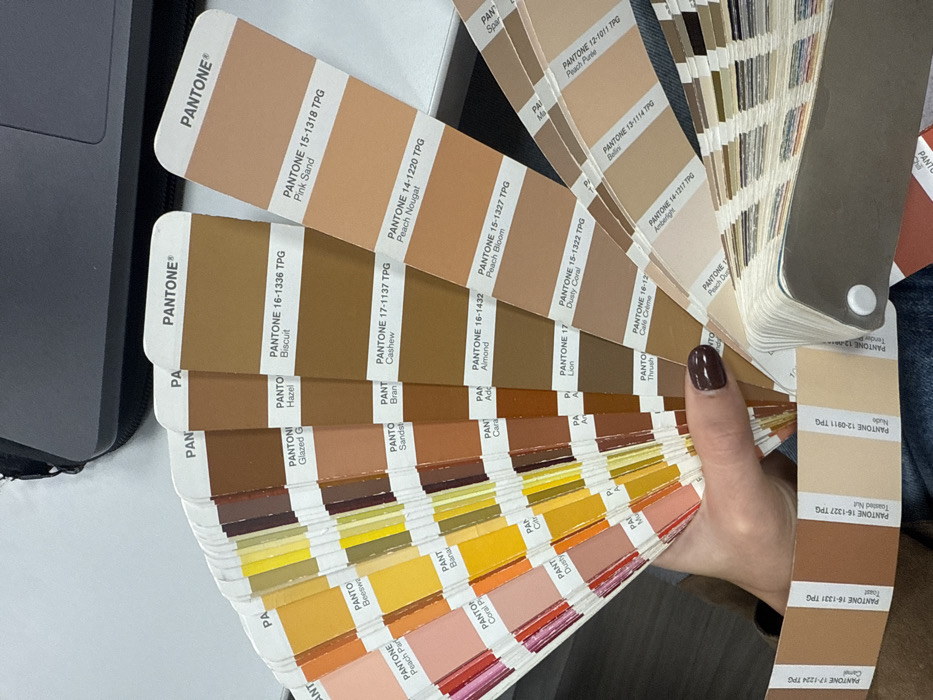 A human hand, with nails painted dark reddish-brown, holds and fans out multiple Pantone color swatch decks against a light surface in Naples, Italy