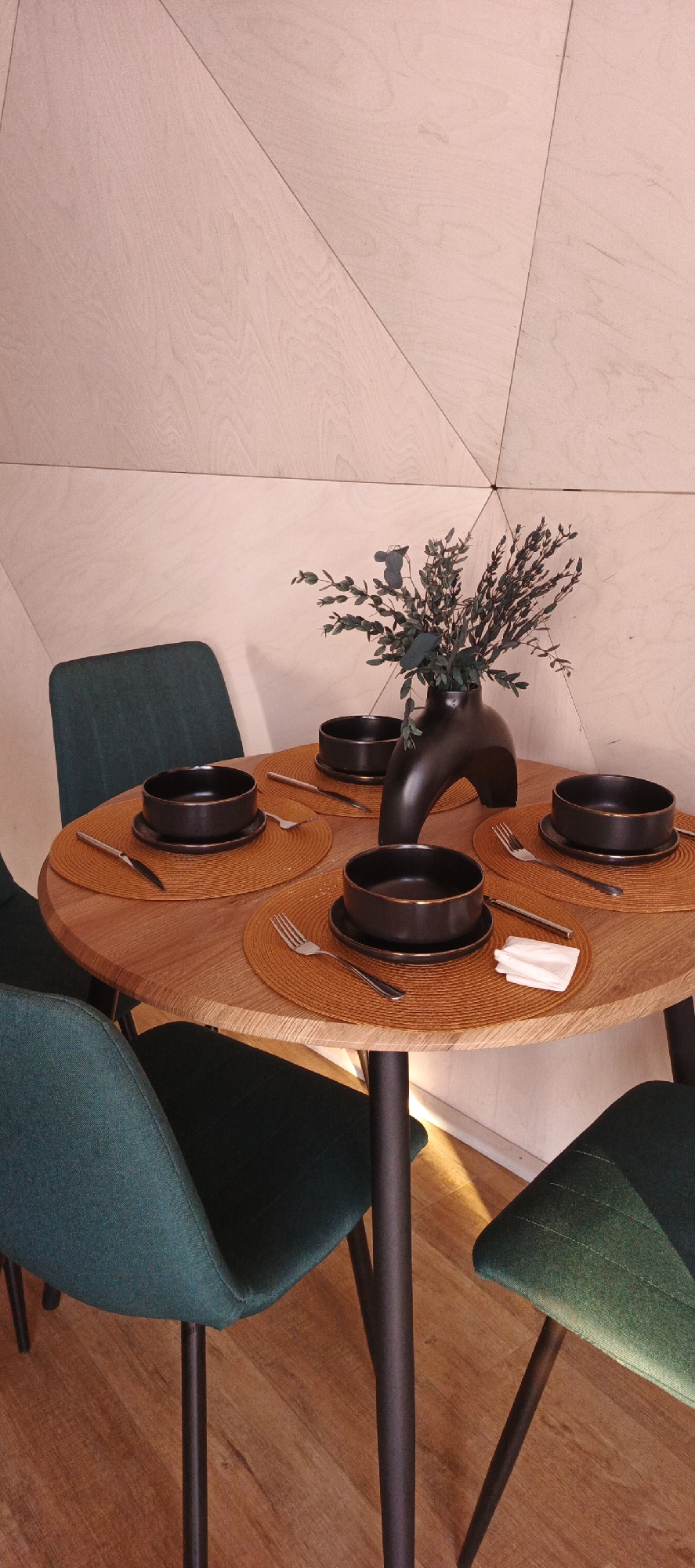 A well-lit interior shows a round wooden dining table set for four. The table is centered with a black vase containing a floral arrangement of green and grey foliage. Each place setting consists of an orange woven placemat, a black bowl atop a black saucer, and silverware – a fork and knife. A folded white napkin rests on one of the placemats. The table is surrounded by four modern chairs upholstered in a teal-green fabric with dark metal legs. The walls behind the table are paneled with light-colored wood, creating a geometric pattern. The floor is wooden. The scene is sterile with no other indication of activity. There is no indication of the location in the city of Iskateley, Russia. There are no people present.
