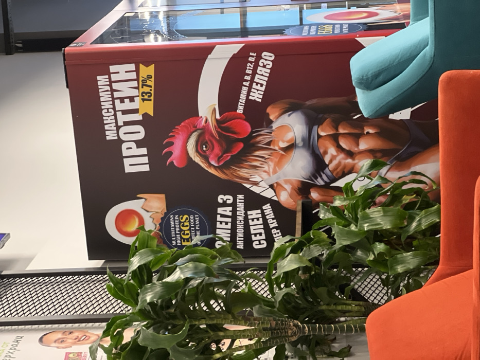 The scene depicts an interior view of a commercial or public space in Pernik, Bulgaria, characterized by prominent advertising and seating. A large, vertical advertisement poster, or digital display, dominates the right half of the frame. This display features a stylized image of a rooster's head attached to a highly muscular, human-like female torso wearing a grey sports bra and bikini bottom. The poster's text, primarily in Bulgarian, includes "МАКСИМУМ ПРОТЕИН 13.7%" (MAXIMUM PROTEIN 13.7%) at the top. To the left of the rooster figure, a graphic of a cracked egg with a vibrant orange yolk is visible, accompanied by the English text "MULTIVITAMINS HIGH PROTEIN EGGS PERFECT FOOD ON THE PLANET," and additional Bulgarian text mentioning "ОМЕГА 3 АНТИОКСИДАНТИ СЕЛЕН" (OMEGA 3 ANTIOXIDANTS SELENIUM). Further down the poster, near the muscular figure, text lists "ВИТАМИН А, В12, D, E ЖЕЛЯЗО" (VITAMIN A, B12, D, E IRON). In the foreground, a vibrant orange upholstered armchair is partially visible on the left, obscuring the lower left corner of the advertisement. To its right, a teal upholstered armchair is partially visible. Two tall, leafy green potted plants are situated between the orange armchair and the advertisement, partially obscuring the poster and a dark, grated wall panel behind them. To the far left, behind the plants and grate, a portion of another poster or display shows a smiling female face. The right side of the image features a reflective surface, likely glass, showing ambient light and reflections of the interior space. The overall lighting suggests an illuminated indoor environment.